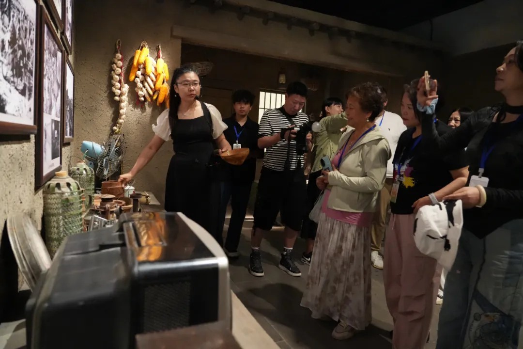 采访团一行在塔城⼿⻛琴博物馆参观。