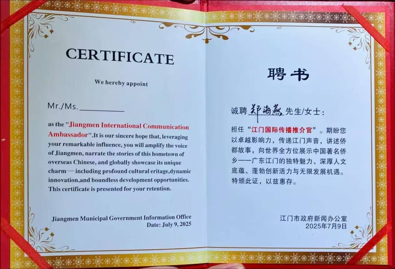 《委国侨报》副社长郑海燕获聘“江门国际传播推介官”